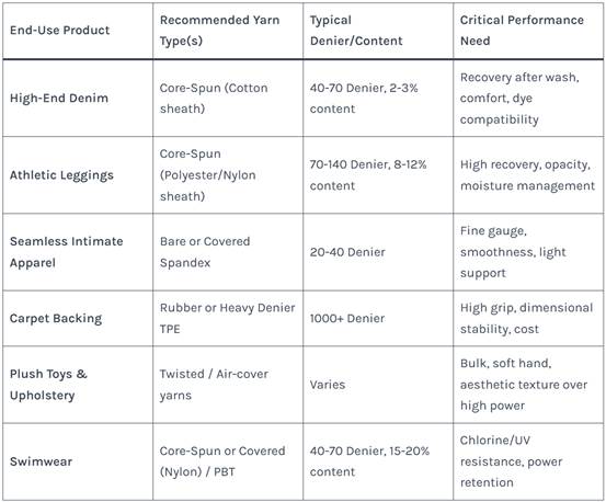 Choosing an elastic yarn is a technical balancing act between performance, processability, aesthetic, and cost. A core-spun yarn is unmatched for durability in daily wear, while a covered yarn solves specific engineering challenges in trims. For non-apparel uses like carpet or toys, rubber or TPE may offer the best value. Always request technical data sheets, sample cones for mill trials, and be clear with your supplier about your fabric process and end-use requirements.